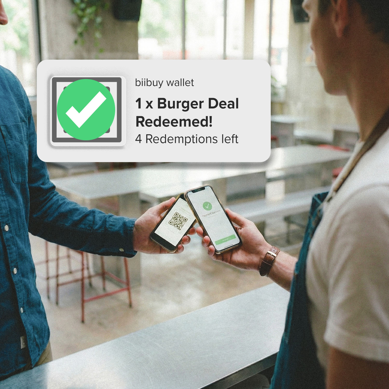 Deals you purchased are saved as unique QR codes in your biibuy wallet. You can access your wallet at anytime